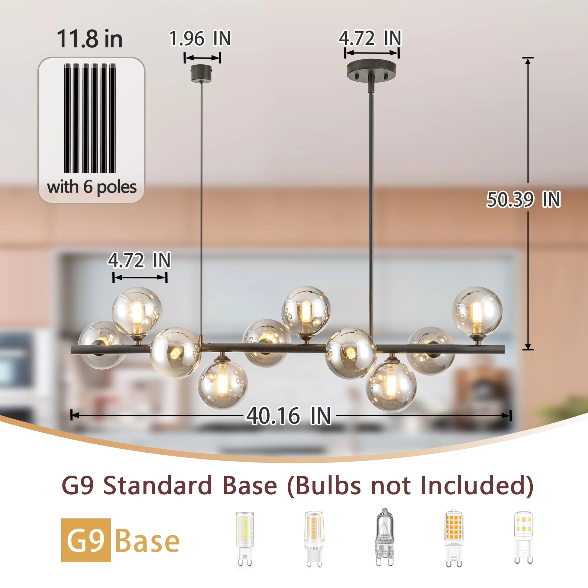 10-Light Matte Black Adjustable Chandelier with Smoked Glass Globe